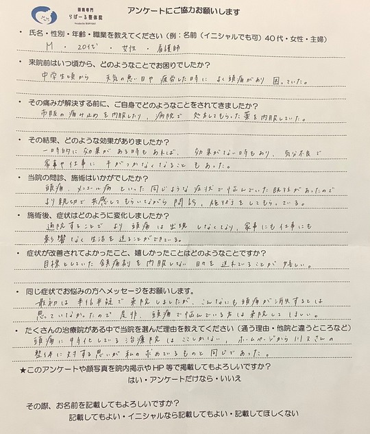 最初は半信半疑で来院しましたが、こんなにも頭痛が消失するとは思っていなかったので是非、頭痛で悩んでいる方は来院してほしい。